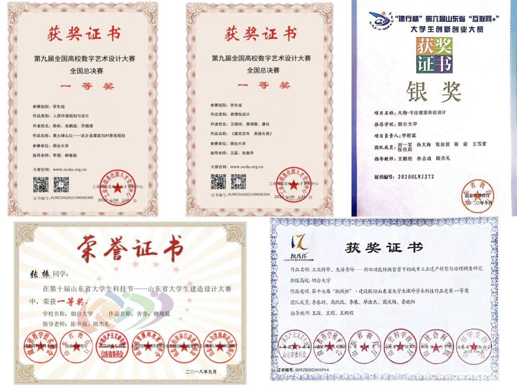 五年來,學院多支社會實踐隊獲省級表彰,學院團委兩次蟬聯煙臺大學“紅旗團委”榮譽稱號并在五四表彰中獲多項榮譽;學生獲山東省優秀學生干部、優秀學生、優秀畢業生等榮譽稱號 68人次,8人考取山東省選調生。學生團隊獲“互聯網+”大賽、“挑戰杯”、全國高校數字藝術設計大賽(NCDA)、山東省大學生建造設計大賽、中國好創意暨全國數字藝術設計大賽等各類各創新創業、學科競賽獎共135項。