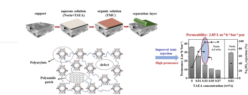 相關工作以“Molecularly microporous polyarylate-polyamide nanofiltration membrane patched by tris(2-aminoethyl)amine for ionic sieving”為題發表在國際水處理權威期刊《Desalination》上,該工作的第一作者為我院青年博士翟哲,通訊作者為深圳大學牛青山教授和我校化學化工學院趙玉潮教授,煙臺大學為第一單位。該研究得到了國家自然科學基金和山東省自然科學基金的資助。