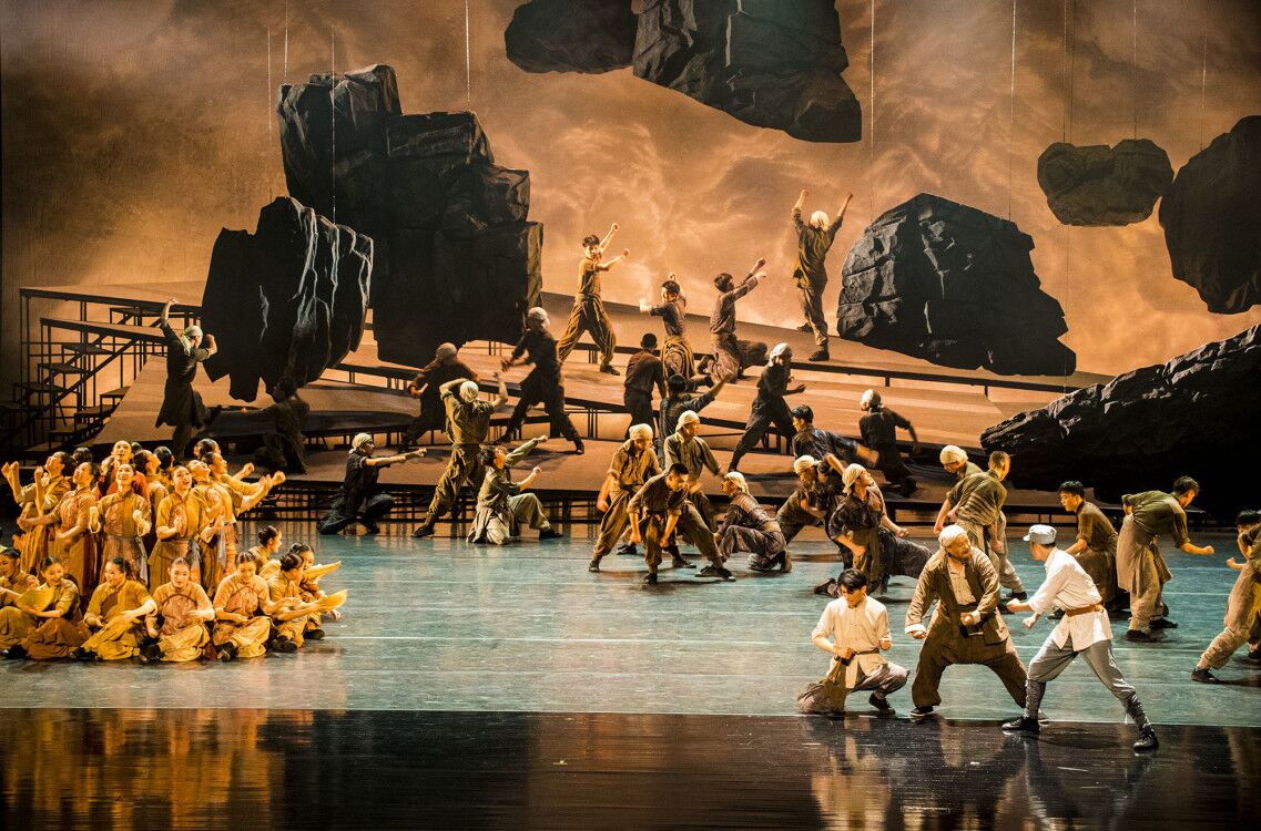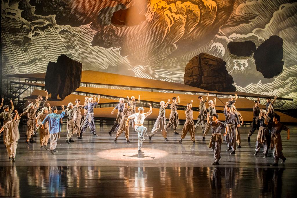 在舞蹈配樂上,《地雷戰》將具有海陽特色的民間小調、秧歌劇調以及具有音樂性的民間方言賦予民族搖滾樂的音樂風格和精神內涵,形成了融合電子、民族、電聲、大管弦樂在內的包容性音樂氣質。在舞美方面,該劇運用象征性的造型元素和隱喻性的藝術語匯,山、石、雷等舞臺道具與演員剛柔并濟的舞姿融為一體,讓現場觀眾有身臨其境之感。