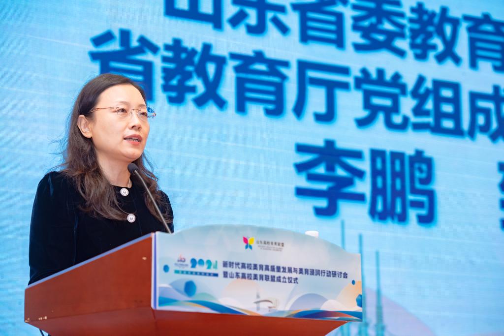 李鵬在致辭中對山東學校美育工作做了總結和展望。她指出,山東省學校美育工作以提高學生審美和人文素養為目標,把美育納入學校人才培養全過程,在教育教學、資源保障、品牌項目、推進機制等方面持續發力,學校美育工作全面提升。在深入實施學校美育浸潤行動過程中,成立山東高校美育聯盟是山東省教育系統進一步加強學校美育工作、強化美育育人功能的重要舉措。希望山東高校美育聯盟以為黨育人、為國育才的高度責任感和使命感,著眼全體學生德智體美勞全面發展,深化校際間交流合作與協同發展,讓學生獲得美育的浸潤滋養,塑造健全人格,成長為能夠擔當民族復興大任的時代新人。