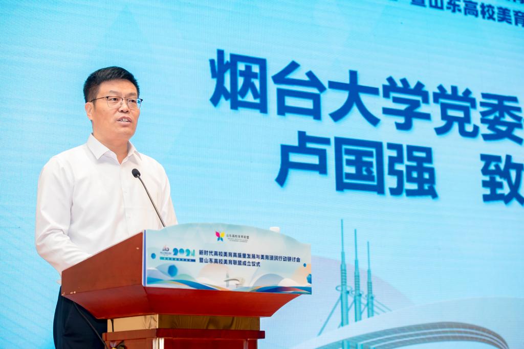 盧國強在致辭中代表煙臺大學對與會領導、專家以及兄弟高校同仁的到來表示熱烈歡迎,并介紹了學校發展情況和在美育工作方面的經驗做法。他表示,時值四秩芳華的煙臺大學正站在新的歷史發展起點,向著學校第五次黨代會確立的“建設特色鮮明、開放創新、國內外具有重要影響力的高水平大學”目標奮勇前行。煙臺大學愿與兄弟高校共同攜手,大力弘揚中華美育精神,加強全環境美育生態建設,以美育浸潤學生、浸潤教師、浸潤學校,培養更多德智體美勞全面發展的社會主義建設者和接班人,為建設教育強國、譜寫中國式現代化山東篇章作出新的更大貢獻。