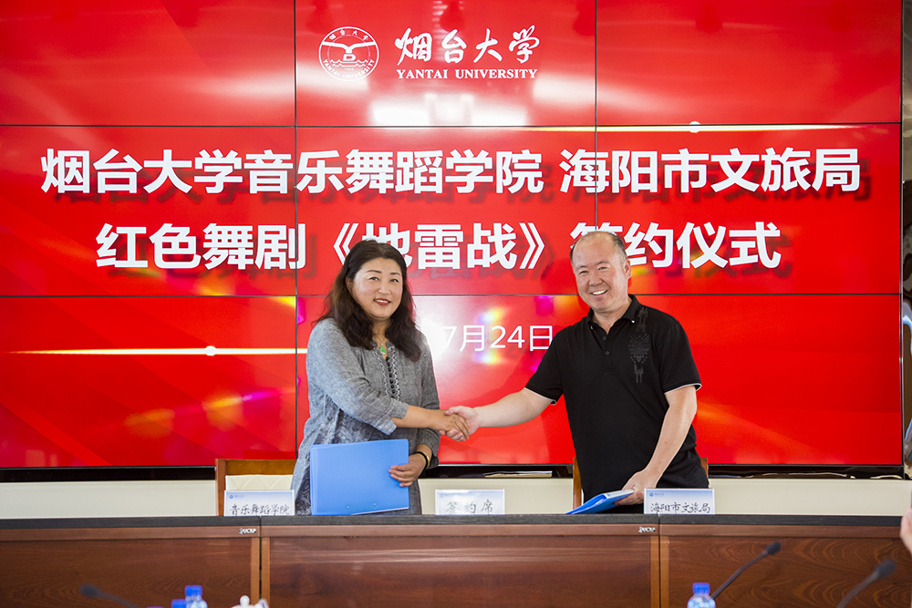 7月24日,煙臺大學音樂舞蹈學院與海陽市文旅局舉辦紅色舞劇《地雷戰》簽約儀式,海陽市委常委、組織部長楊濤,海陽市文旅局局長趙中國、副局長李晶濤,煙臺大學黨委常委王澤光、于秀國,服務地方辦公室、社科(科技)處、音樂舞蹈學院相關負責人和部分教師代表參加簽約儀式。