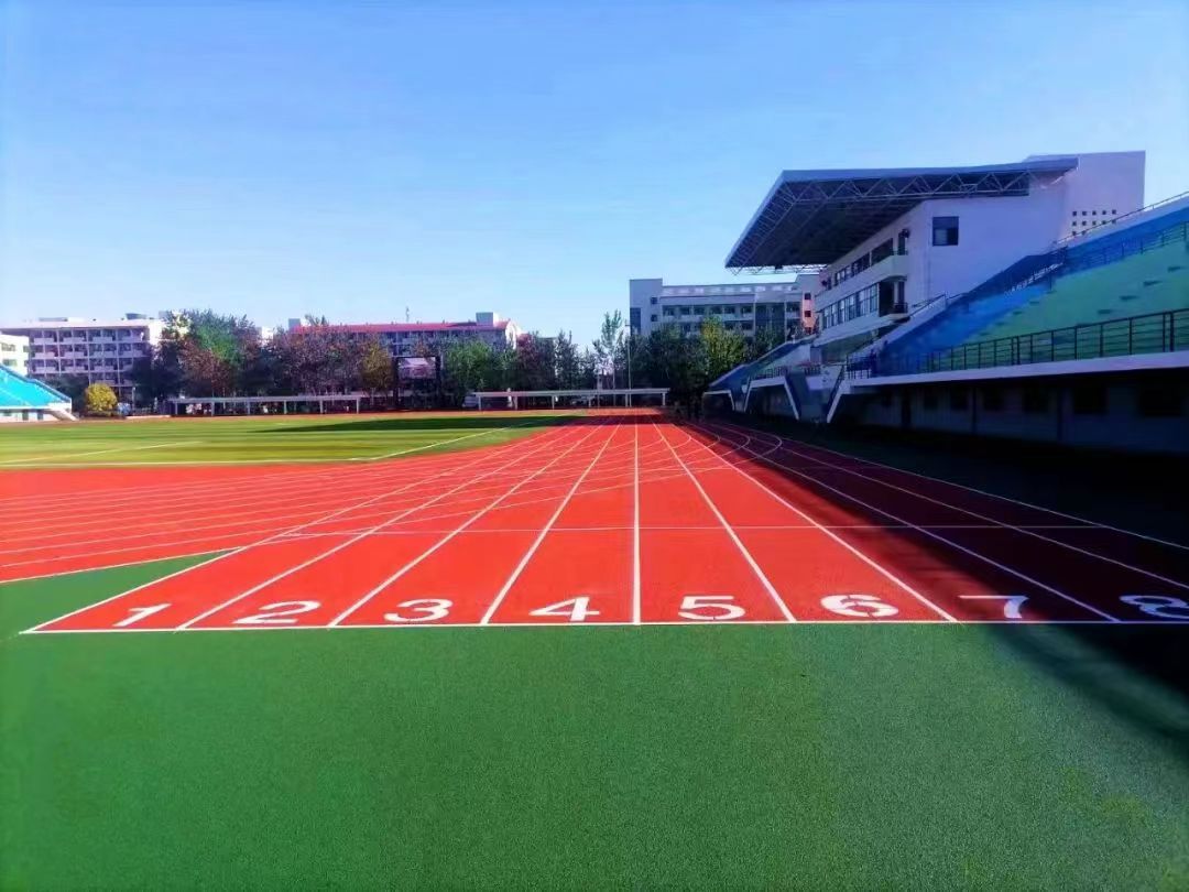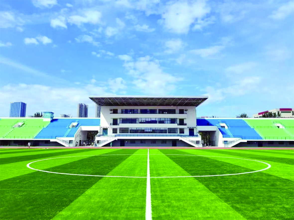 據工程科任科長介紹,體育場改造以“美觀性、實用性相統一”為原則,依托原結構進行改造,涉及看臺、塑膠跑道和草坪三部分,翻修后的主席臺中心區采用了海灰配色,看臺區改設豆蔻綠和淡酞藍雙配色,整體效果更加美觀大方;塑膠跑道改造包含整修地面、涂設防水底油、鋪設基材、噴涂表層橡膠顆粒等內容,共翻修跑道及輔助場地面積可達12000平方米;草坪選用草簇結構編織,其底部采用聚丙烯材料編織,保證產品的強度和耐久性。