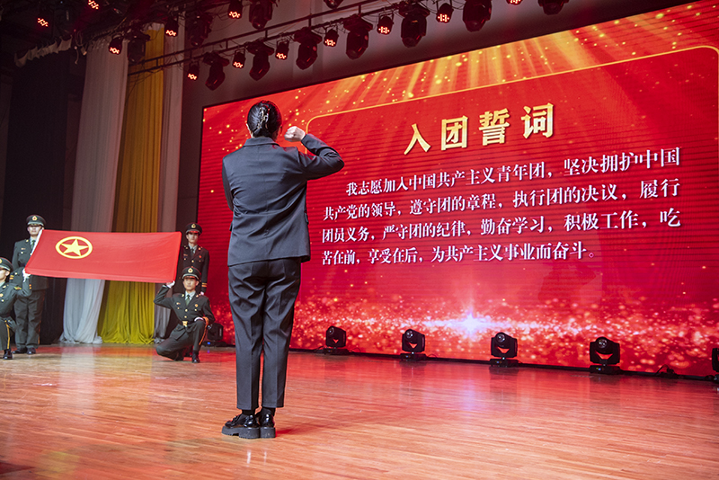 在頒獎典禮上,“石榴籽”團隊代表王嘉琪以《信念,為青春引航》為題講述了煙大團員青年自覺把青春夢融入中國夢,堅定信念、緊跟黨走的決心與信心;舞劇《地雷戰(zhàn)》深情謳歌了中華兒女在中國共產(chǎn)黨領(lǐng)導下的不屈斗志和家國情懷;舞蹈《有我》激勵廣大團員青年要勇于做走在時代前列的奮進者、開拓者、奉獻者;“肯奮斗”榜樣代表高澤宇的演講《奮斗,讓青春無悔》,生動講述了自己將專業(yè)所學與奮斗熱情融入高水平大學建設(shè)進程的經(jīng)歷,勉勵同學們爭當偉大理想的追夢人,爭做偉大事業(yè)的生力軍;2022年新發(fā)展團員代表通過集體宣誓的方式,表達出團員青年勇挑重擔、堪當大任的決心和信心;朗誦《就是那一抹紅》引導廣大團員青年要始終以黨的旗幟為旗幟、以黨的意志為意志、以黨的使命為使命,把青春奮斗融入黨和人民的事業(yè)中;視頻《青年志愿者》致敬全體煙大青年,他們用無數(shù)份小愛成就大愛,用愛心關(guān)懷世界,用行動溫暖人心;合唱《中國青年》歌頌了中國青年欣欣向榮、踔厲奮發(fā)的時代風貌。
