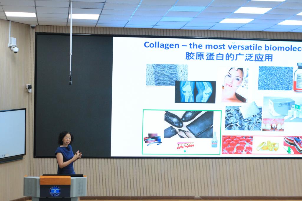 儀式結(jié)束后,徐雨佳面向?qū)W院師生作了題為《蛋白質(zhì)設(shè)計:優(yōu)化仿膠原蛋白醫(yī)用材料的功能和性質(zhì)》的學(xué)術(shù)報告。