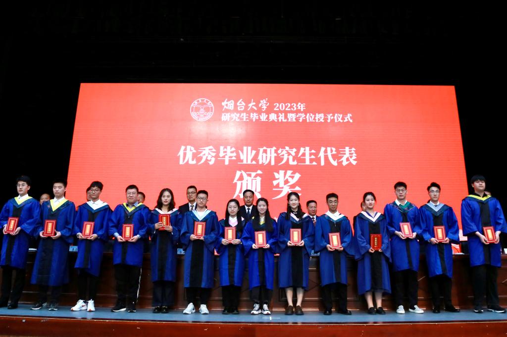 典禮在雄壯的國歌聲中拉開帷幕。黨委副書記郭建國,黨委常委、副校長馮素玲分別宣讀《煙臺大學關于表彰2023屆優(yōu)秀畢業(yè)生的決定》《煙臺大學2023年關于授予韓昆等4名同學博士學位、王晶晶等1080名同學碩士學位的決定》。學校領導為優(yōu)秀畢業(yè)生代表頒獎。