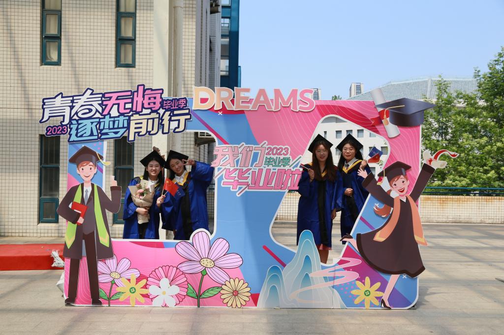 典禮過程中,畢業(yè)生送別MV以及溫馨的畢業(yè)祝福組歌《你曾是少年》《如果我們不曾相遇》《星辰大海》《鳳凰花開的路口》,將畢業(yè)生的思緒帶回與煙大初次相遇、在煙園成長的珍貴時光。典禮結束后,畢業(yè)生們在活潑新穎的畢業(yè)季打卡墻前拍照留念的身影,構成一道亮麗的風景線。“校友卡”“火車票”“手機屏”等主題展板創(chuàng)意十足,吸引畢業(yè)生紛紛駐足拍照;展板上“愿你千帆過盡,歸來仍是少年”“時光不老,我們不散”“畢業(yè)季,我們不說再見”“青春無悔,逐夢前行”等感人至深的話語,傳遞著學校對畢業(yè)生們的美好祝愿。
