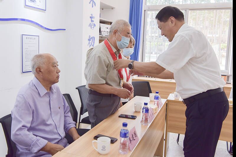 6月25日上午,煙臺大學在離退休黨群服務中心舉行“光榮在黨50年”紀念章頒發儀式。黨委書記張殿臣為參加本次活動的10位老黨員逐一佩戴“光榮在黨50年”紀念章,黨委常委、副校長王強和黨委常委、組織部部長王澤光為參會老黨員頒發“政治生日”賀卡,贈送具有紀念意義的“政治生日”禮物。滿滿的“儀式感”,進一步激發了老黨員的榮譽感、歸屬感和責任感,進一步強化了老黨員的身份意識和宗旨意識。