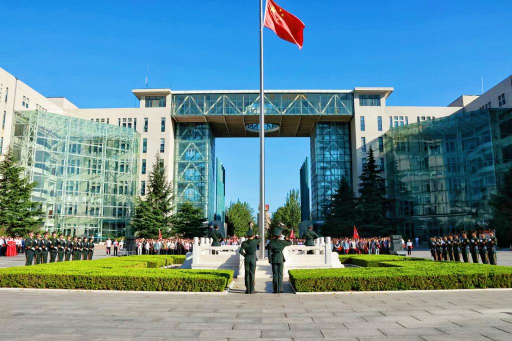 升旗手振臂一揮,五星紅旗伴隨著國歌聲冉冉升起。師生們面向國旗肅立行注目禮,高唱國歌,共同感受這一莊嚴而自豪的時刻。