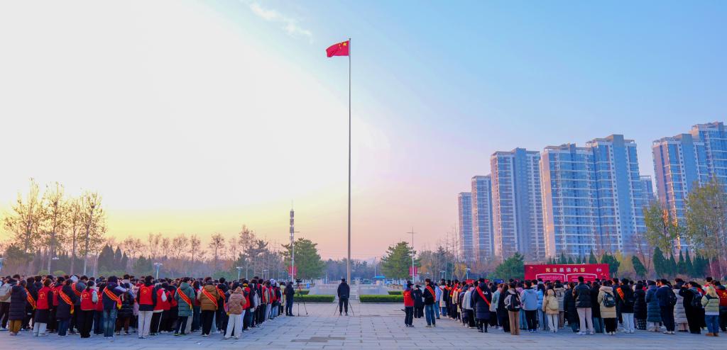 上午7時,五星紅旗伴隨著雄壯的國歌聲在國旗廣場升起?!氨緫椃ㄒ苑傻男问酱_認(rèn)了中國各族人民奮斗的成果,規(guī)定了國家的根本制度和根本任務(wù),是國家的根本法,具有最高的法律效力……”師生代表們共同進行了憲法晨讀,齊聲朗讀憲法條文,用心體悟憲法精神。法學(xué)院學(xué)生合唱歌曲《憲法伴我們成長》,歌聲嘹亮,旋律輕快,青春的聲音詮釋著對憲法的崇敬。學(xué)生代表邵姿怡、石子岳依次進行演講和宣誓,暢談內(nèi)心感悟,共傳法治精神。