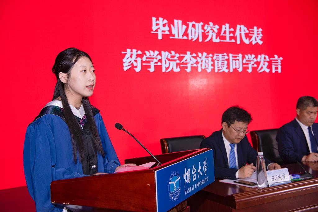 在代表發言環節,研究生導師代表、法學院副院長張玉東教授以老師和學長的身份勉勵全體畢業生保持終身學習的態度,堅持實事求是的科學精神,勇于擔當社會責任和使命,珍惜和維護母校的榮譽,時刻銘記煙臺大學的精神和文化,勇往直前、追求卓越,為自己的人生寫下更加輝煌的篇章。畢業研究生代表、藥學院李海霞同學代表2024屆全體研究生畢業生祝福母校宏圖更展、再譜華章,表示將牢記“守信、求實、好學、力行”的煙大校訓,發揚“海納百川,敢為人先”的煙大精神,踔厲奮發、砥礪前行,在中國式現代化的新征程中奏響煙大人的奮進之歌。