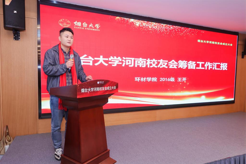 環境與材料工程學院2016級校友王開作煙臺大學河南校友會籌備工作匯報。合作發展處副處長、校友工作辦公室副主任陸代剛宣讀《關于同意成立煙臺大學河南校友會的批復》,并宣布理事會主要成員名單。