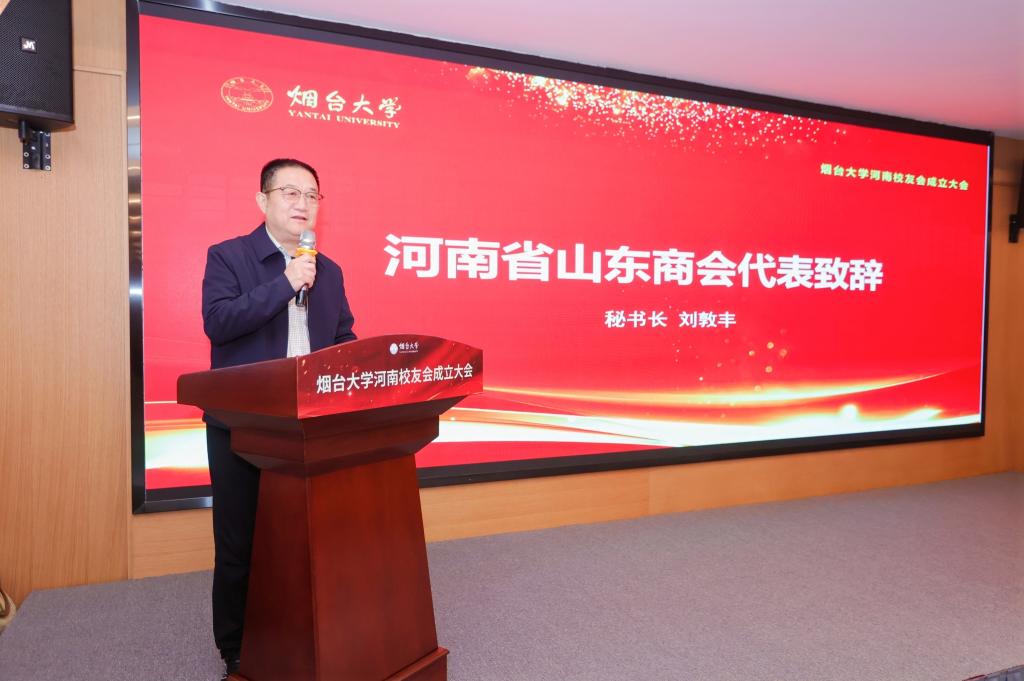 河南省山東商會秘書長劉敦豐代表商會致賀詞。學校老師、兄弟校友分會通過錄制視頻、現場贈禮等方式向河南校友會成立表示祝賀。